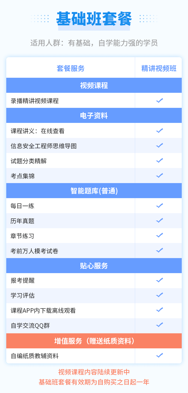 包含精講視頻課程、紙質(zhì)內(nèi)部輔導(dǎo)資料、考前點睛資料、智能題庫隨時刷題、考前模擬試卷、電子資料輔助學(xué)習(xí)等。